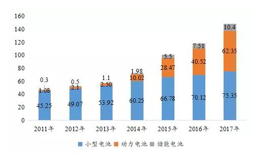 2011-2017年全球不同類型鋰電池出貨量(單位:GWh)