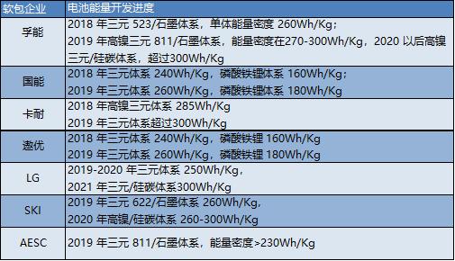 主流軟包電池企業(yè)單體能量密度進階之路。業(yè)內(nèi)企業(yè)推出的量產(chǎn)軟包產(chǎn)品,2016年行業(yè)平均水平在 200-210Wh/Kg, 2018 年電池企業(yè)軟包能量密度達到 260Wh/Kg,到 2019 年,企業(yè)已經(jīng)開發(fā)出 300Wh/Kg 的軟包電池。目前,國內(nèi)外軟包企業(yè)紛紛布局高能量密度軟包電池,以滿足未來新能車市場的需求。