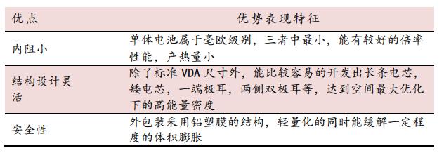 軟包電池有能量密度最高的優(yōu)勢,因此超高能量密度電池單體的解決方案都會選擇軟包技術(shù)。最近國家科技部公布新能源汽車重點專項項目,其中有一項關(guān)鍵技術(shù)指標要求電池單體能量密度達到 300Wh/Kg。寧德時代“新一代鋰離子動力電池產(chǎn)業(yè)化技術(shù)開發(fā)”和天津力神“高比能量動力鋰離子電池開發(fā)與產(chǎn)業(yè)化技術(shù)攻關(guān)”項目均有入圍,其中天津力神研發(fā)的軟包電池能量密度可達303Wh/Kg。在國家科技部重大專項“高比能量動力鋰電池的研發(fā)與集成應(yīng)用”項目中,國軒高科生產(chǎn)的三元 811 軟包樣品通過科技部中期檢驗,其能量密度達到了 302Wh/Kg。三家承擔新型鋰離子電池項目的企業(yè),都選擇了三元軟包電池技術(shù)路線,來實現(xiàn)單體能量密度超過 300Wh/Kg 的目標。國家 863 計劃節(jié)能與新能源汽車重大項目組組長歐陽明高點評結(jié)論,寧德時代三元軟包電池在性能和安全各項指標完全滿足國標要求。可以看到,技術(shù)端電池結(jié)構(gòu)采用軟包結(jié)構(gòu)是實現(xiàn)高能量密度的有效路徑。另外,包動力電池除了結(jié)構(gòu)重量輕,能量密度高等顯著優(yōu)點以外,還具有方形硬殼和圓柱不具備的其他眾多優(yōu)勢